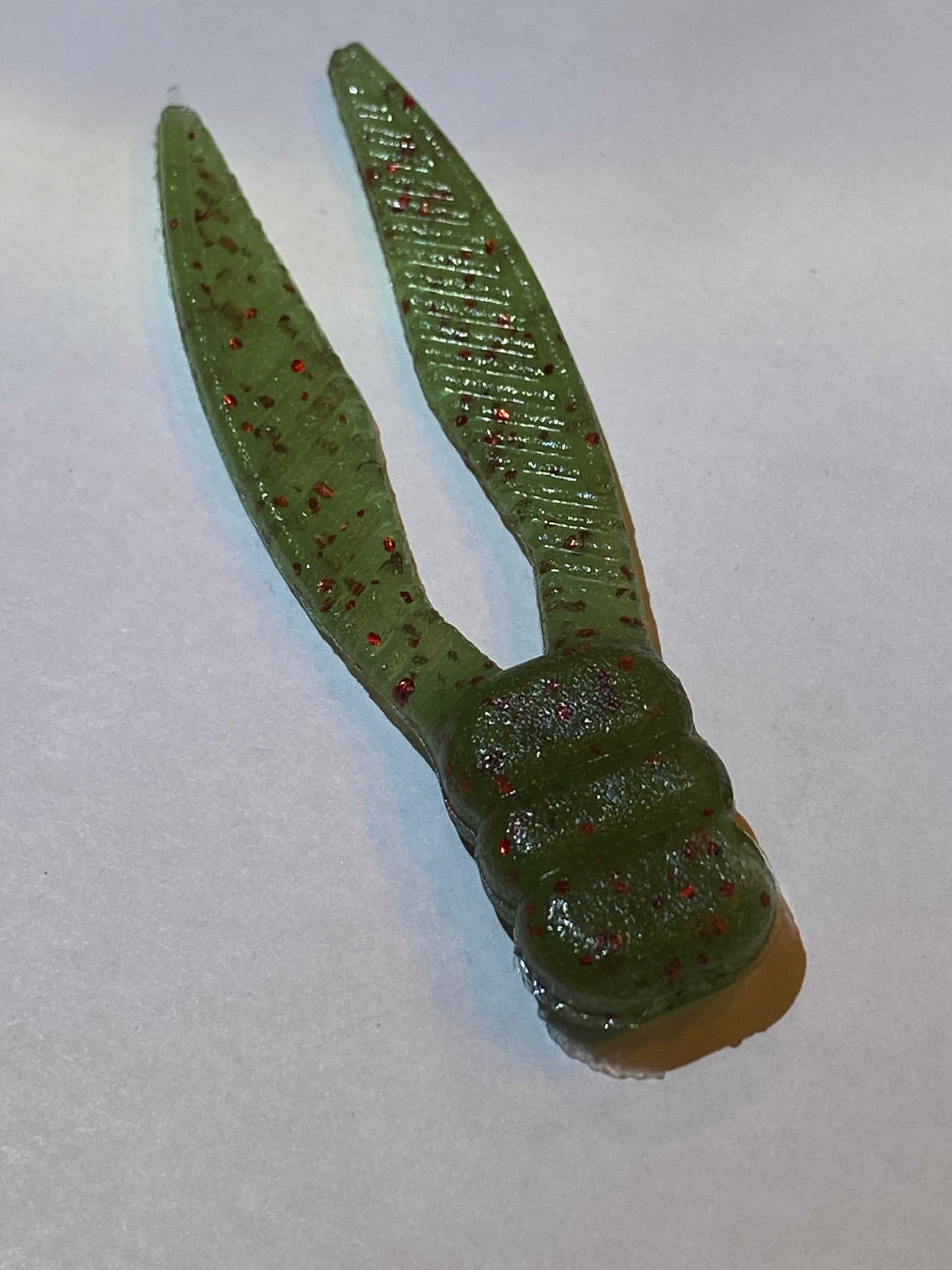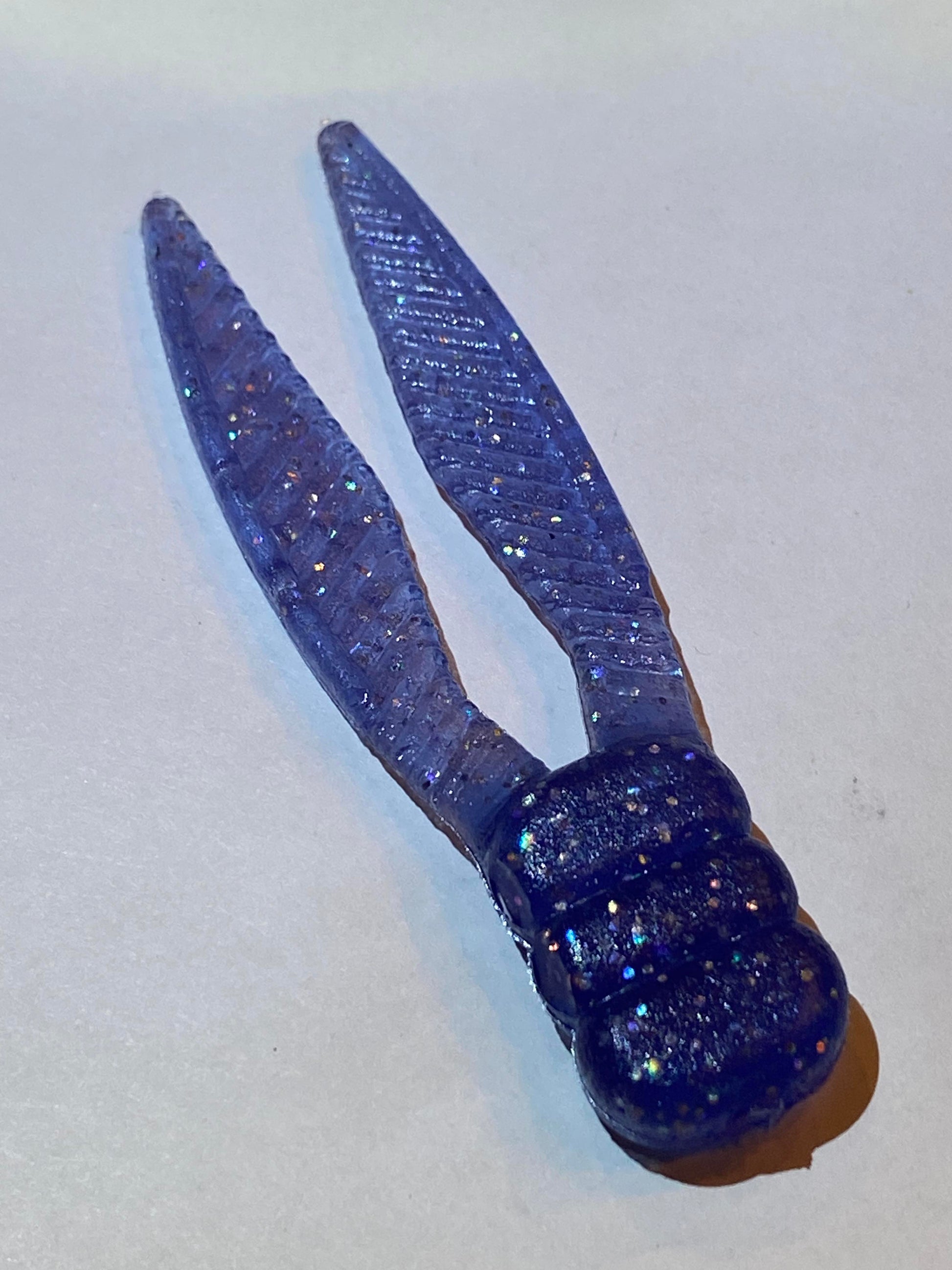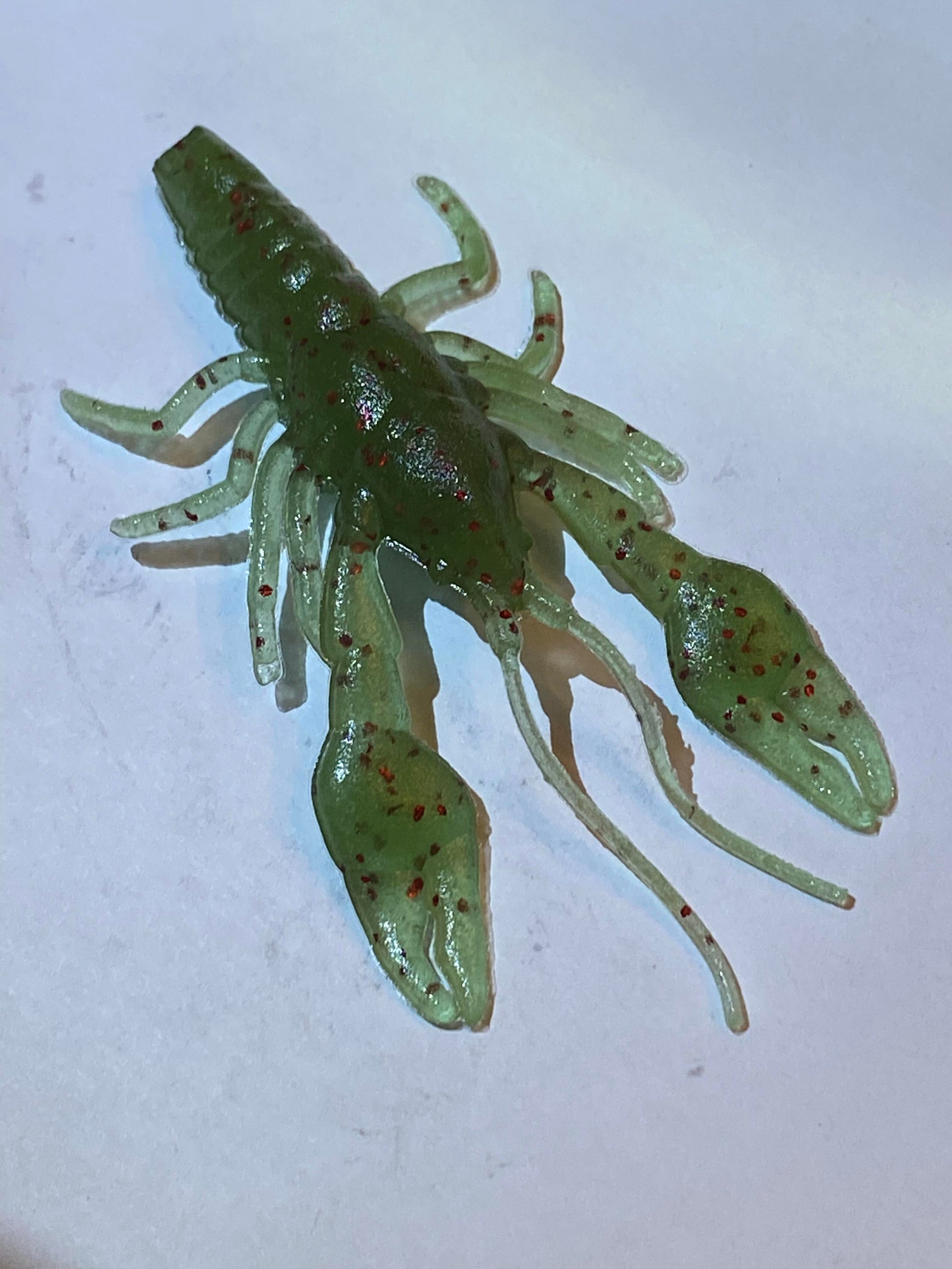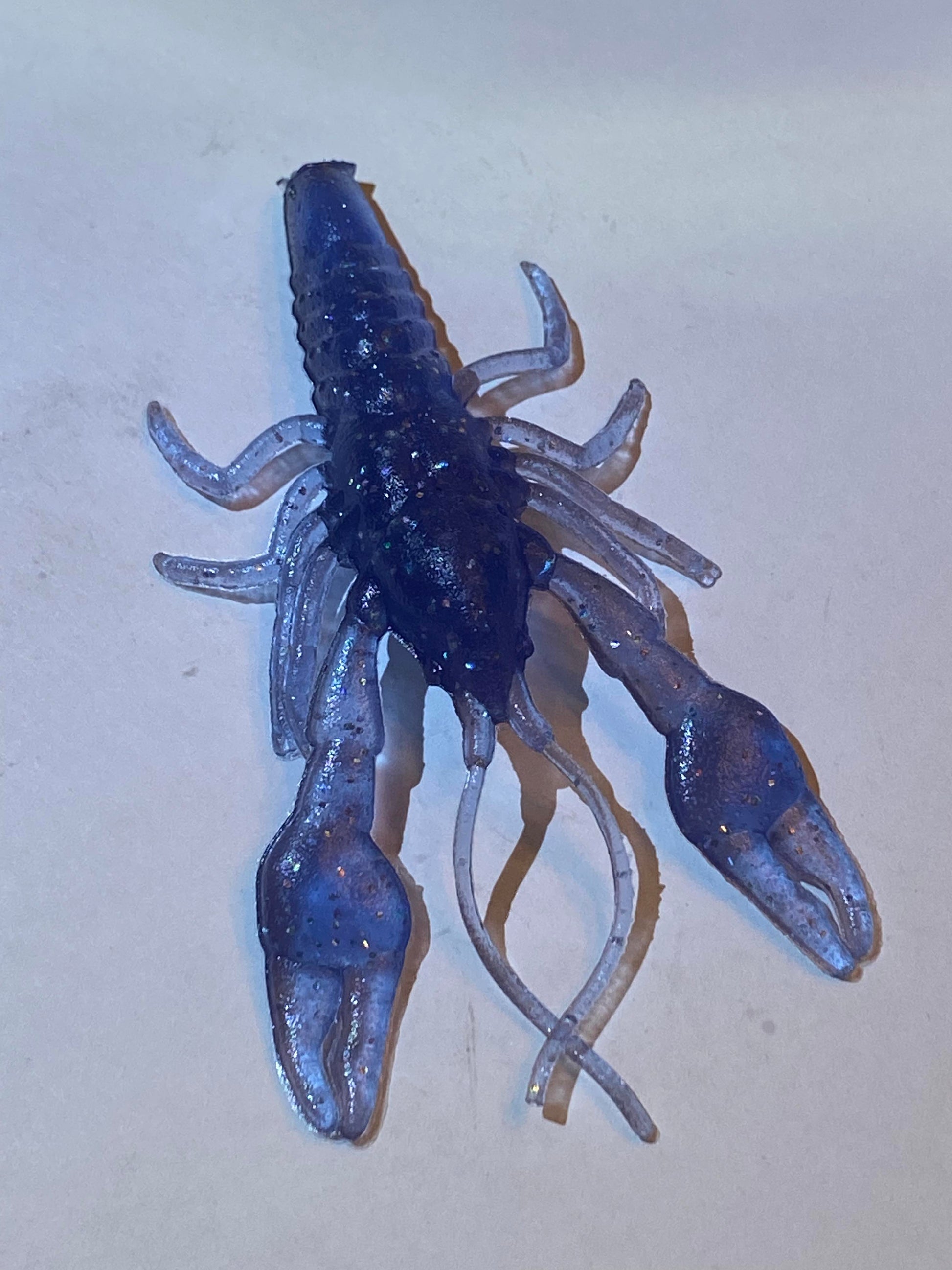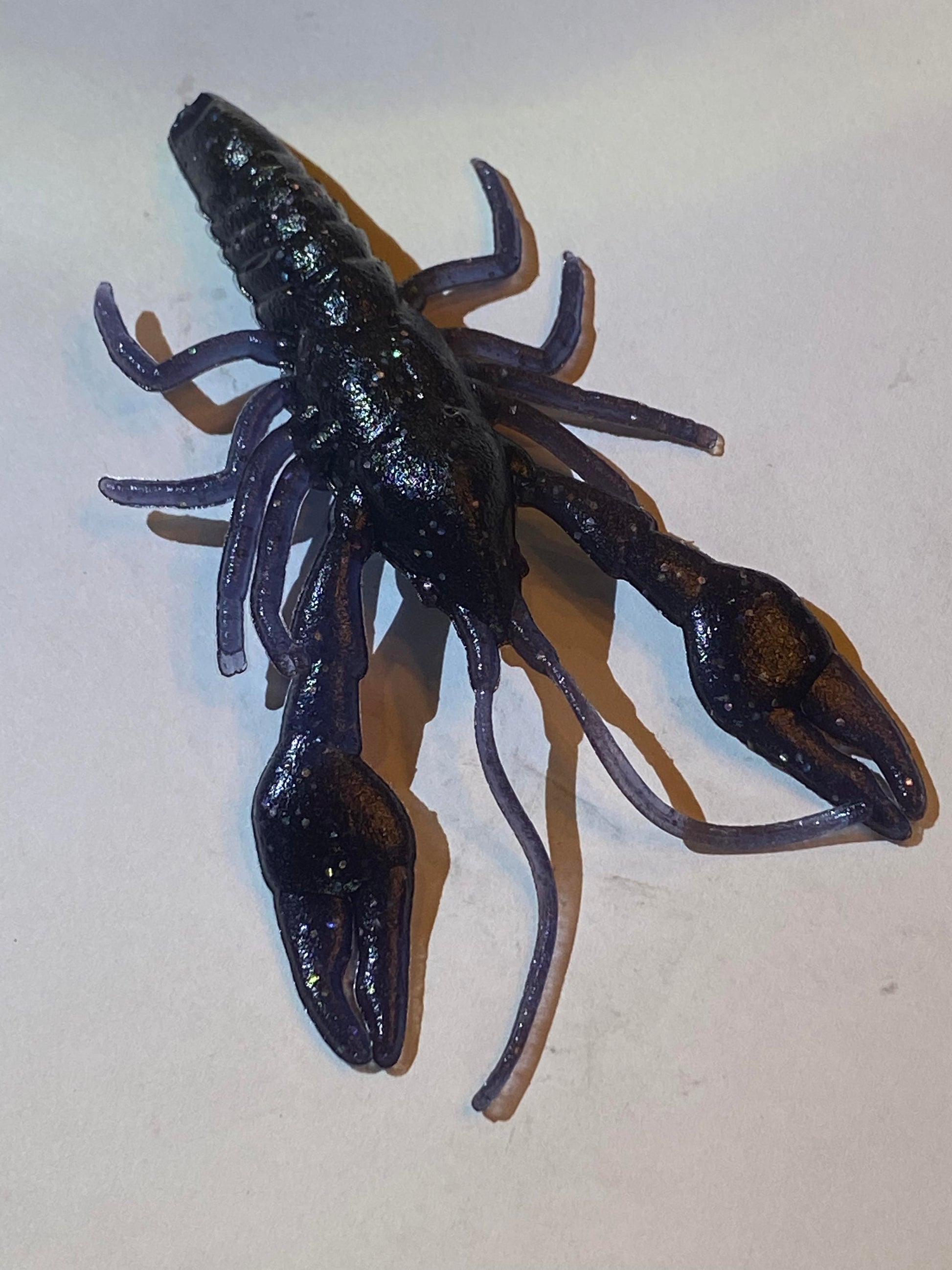 Craw 3 1/2" - This is an "action" craw. It provides a realistic profile when pitching, however, the claws have a super flapping action on retrieve. It will get their attention one way or the other.